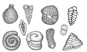 Wel 2/3 van het aardoppervlak is kalkgesteente. Dat is wel bijzonder, want in de 10-30 kilometer dikke aardkorst zelf is calcium niet sterk aanwezig. In het oergesteente, de graniet, zit maar een paar procent calcium. hoe komt dat beetje kalk overal aan de oppervlakte? In kalkgesteente zie je nogal eens schelpen. Die verraden de oorsprong van kalkgesteente en bergen. Er zijn ooit zeeën geweest waarin deze schelpen en koralen en dergelijke hebben geleefd. Ook hele kleine diertjes, zg foraminiferen (foramen = venster, er zitten allemaal kleine holtes in) hebben aan kalkafzettingen geholpen. Deze diertjes laten zien wat je allemaal met kalk kunt bouwen. De gaatjes, de holtes die ze vormen zijn ook typisch voor kalk. Zeewater is verzadigd met opgeloste kalk. Heel gunstig voor het bouwen van een kalkhuisje. In een kalklandschap lopen we op een oeroude zeebodem. Al die kalk is van dierlijke oorsprong.